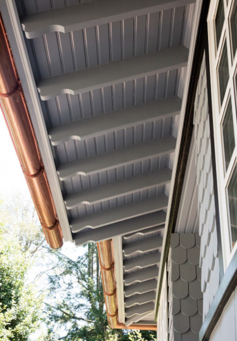 were then infilled between the windows, and great care was demonstrated in laying out the shakes so that all the corners worked together seamlessly. All installation methods were used in accordance with the manufacture’s specifications to accommodate expansion and contraction, as well as fastening. Flashing was also installed as required at all corners and sills. A continuous freeze board was installed on the head of the windows and consisted of two levels of trim and three different moldings to match the adjacent moldings of the existing house. This trim begins with a water table, which protects the windows and holds a two inch trim board above it. On top of this trim is bed molding attached to a second level of trim board. This also was used to finish the area between the rafter tails. Another set of bed molding was then attached to this and further finishes the area between the rafter tails and the seam to the eave. All of the trim joints were fastened together with glue and nails depending on the composite material. “Boral” trim was glued with exterior gorilla glue and PVC molding with Azek PVC cement. Tight joints were also constructed to create maximum binding of the glue. Finally, the rafter tails were exposed and the ends were shaped in a decorative feature to match the existing rafter tails of the house. The new 2x Douglas fir tails were created on site with a template copied from an existing rafter tail. The template was then used to efficiently make all the rafter tails uniform in shape and appearance. In order do this on site and minimize sanding, a system was set up in which one person marked the rafters with a template. The tails would then be cut with a jig saw, leaving an eighth inch of wood remaining. The second person then used a router with a flush cut bit and the template to finish router the tail to its finished size. Finally, it was lightly sanded to remove any rough edges. This method saved time and allowed every tail to be uniform and ready for paint (see pictures below). The distance off of the house for the eave also matched that of the existing house, with the exception of the overhang at the garage door and front entry, which extends out to three feet to allow cover from the elements. 1x6 beaded boards were then attached on top of the rafters to create the soffit. The roof edges were then completed with a rake molding and 2x cedar band above to match the existing house. The roof of the addition was also designed with a low pitch as to not interfere with the bedroom window above. Shingles were selected to match the existing house and copper valleys were installed to fit in with the original time period. Copper gutters and downspouts were also selected in shape and style to match that of the existing house. Together, the exterior elements work smoothly to create an addition, which fits perfectly with the existing house and at the same time, stands as a spectacular feature of the house.